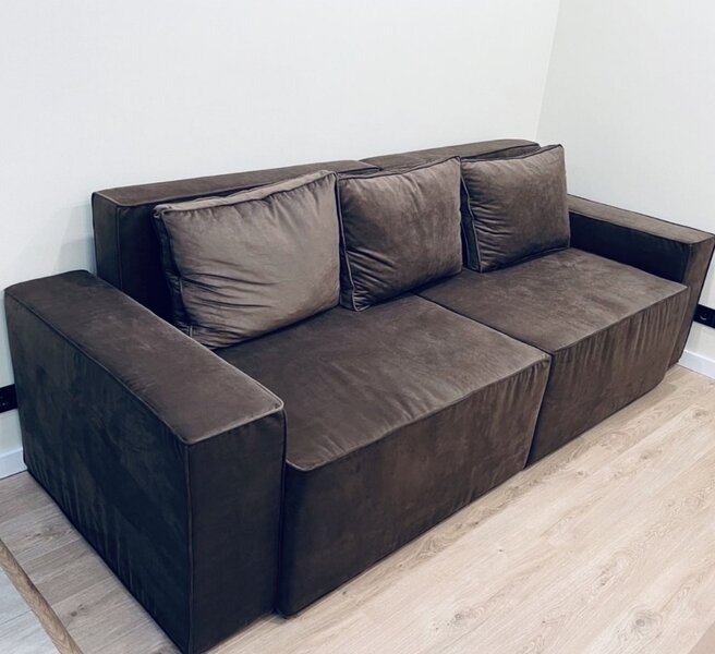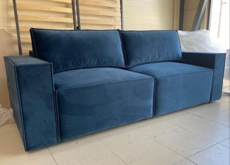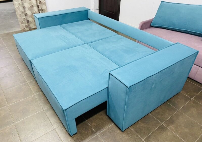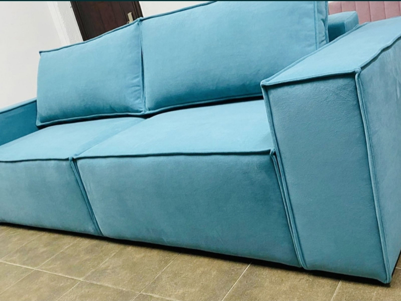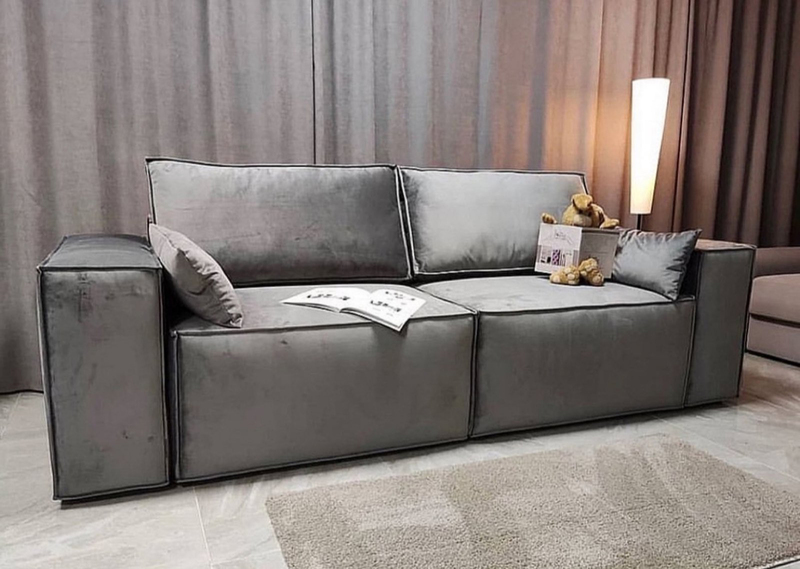 Диван виконаний у сучасному стилі з використанням для оздоблення виворотніх швів. Виворотні шви під час всього терміну використання будуть гарно тримати форму і не розійдуться. Для їх виконання використовують спеціальні нитки і матеріали для закріплення форми. Спальне місце суцільне, без перегибів і зручне для сну. Вивортоні шви не впливають на зрічність спального місця.