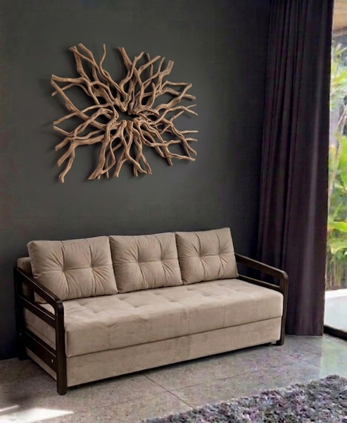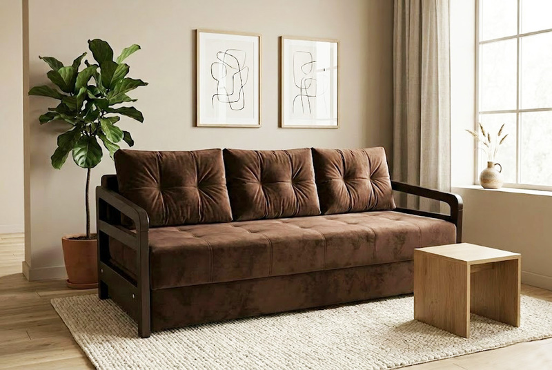 Додайте вашій вітальні сучасного шарму з диваном Лагуна. Ця модель поєднує в собі лаконічність скандинавського стилю і тепло натурального дерева . Дизайн дивану розроблений так, щоб гармонійно вписуватися як у світлі інтер'єри в стилі джапанді, так і в сучасні лофт-простори. Масивні елементи з натурального дерева темно-коричневого відтінку не лише слугують надійною опорою, а й додають інтер'єру особливої статусності. Спинка дивану складається з трьох об’ємних подушок з декоративною стяжкою, які забезпечують ідеальну підтримку спини під час відпочинку. Пряма форма дивану дозволяє компактно розмістити його навіть у невеликій кімнаті, залишаючи простір для журнального столика або кімнатних рослин. Каркас дивану посилений за рахунок цільного брусу "золотий стандарт" 60 мм * 45 мм, який витримує підвищене навантаження.