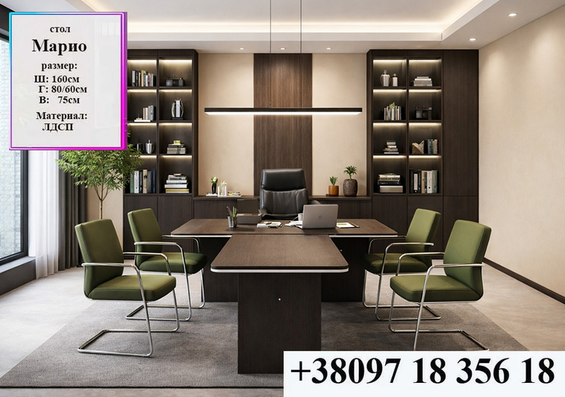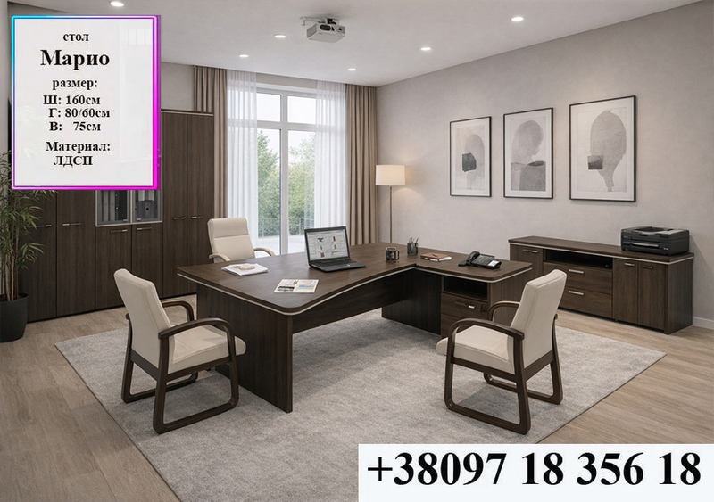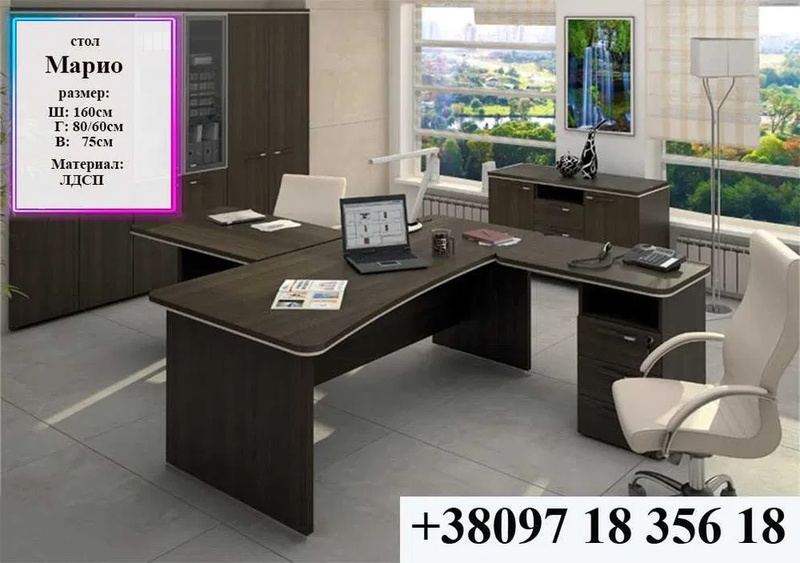Характеристики набору меблів Маріо : Стіл директора 160х80/60х75см Стільниця ДСП 32мм Інші частини ДСП 16мм