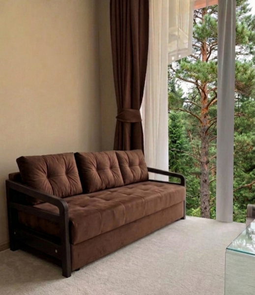 Додайте вашій вітальні сучасного шарму з диваном Лагуна. Ця модель поєднує в собі лаконічність скандинавського стилю і тепло натурального дерева . Дизайн дивану розроблений так, щоб гармонійно вписуватися як у світлі інтер'єри в стилі джапанді, так і в сучасні лофт-простори. Масивні елементи з натурального дерева темно-коричневого відтінку не лише слугують надійною опорою, а й додають інтер'єру особливої статусності. Спинка дивану складається з трьох об’ємних подушок з декоративною стяжкою, які забезпечують ідеальну підтримку спини під час відпочинку. Пряма форма дивану дозволяє компактно розмістити його навіть у невеликій кімнаті, залишаючи простір для журнального столика або кімнатних рослин. Каркас дивану посилений за рахунок цільного брусу "золотий стандарт" 60 мм * 45 мм, який витримує підвищене навантаження.