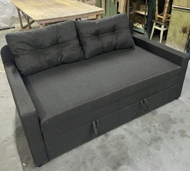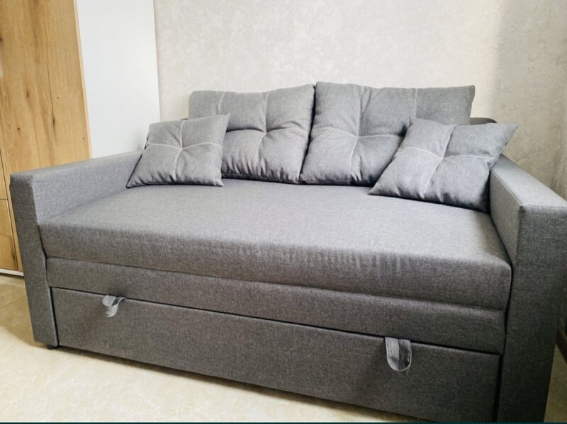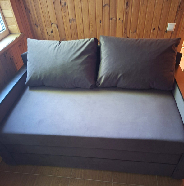 Каркас дивану виконаний з посилоного брусу "золотий стандарт" соснових порід: 60 мм * 45 мм соснових порід дерева. Диван йде у комплекті з двома великими полушками. По всій довжині дивана містка ніша для постільних речей. Ящик для білизни закривається і таким чином запобігає потраплянню пилу всередину.