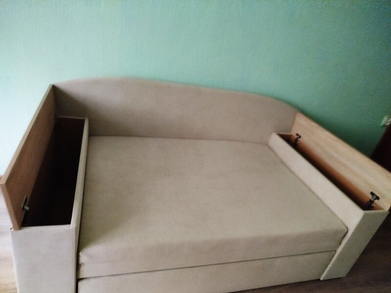 По всій довжині дивана містка ніша для постільних речей. Ящик для білизни закривається і таким чином запобігає потраплянню пилу всередину.