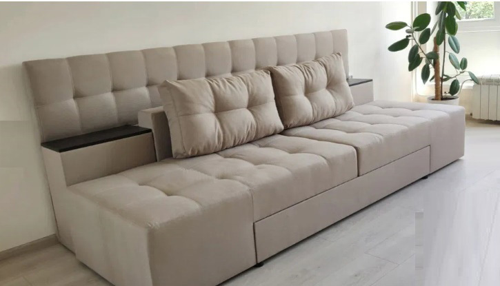 Каркас дивану посилений за рахунок цільного брусу "золотий стандарт" 60 мм * 45 мм, який витримує підвищене навантаження.